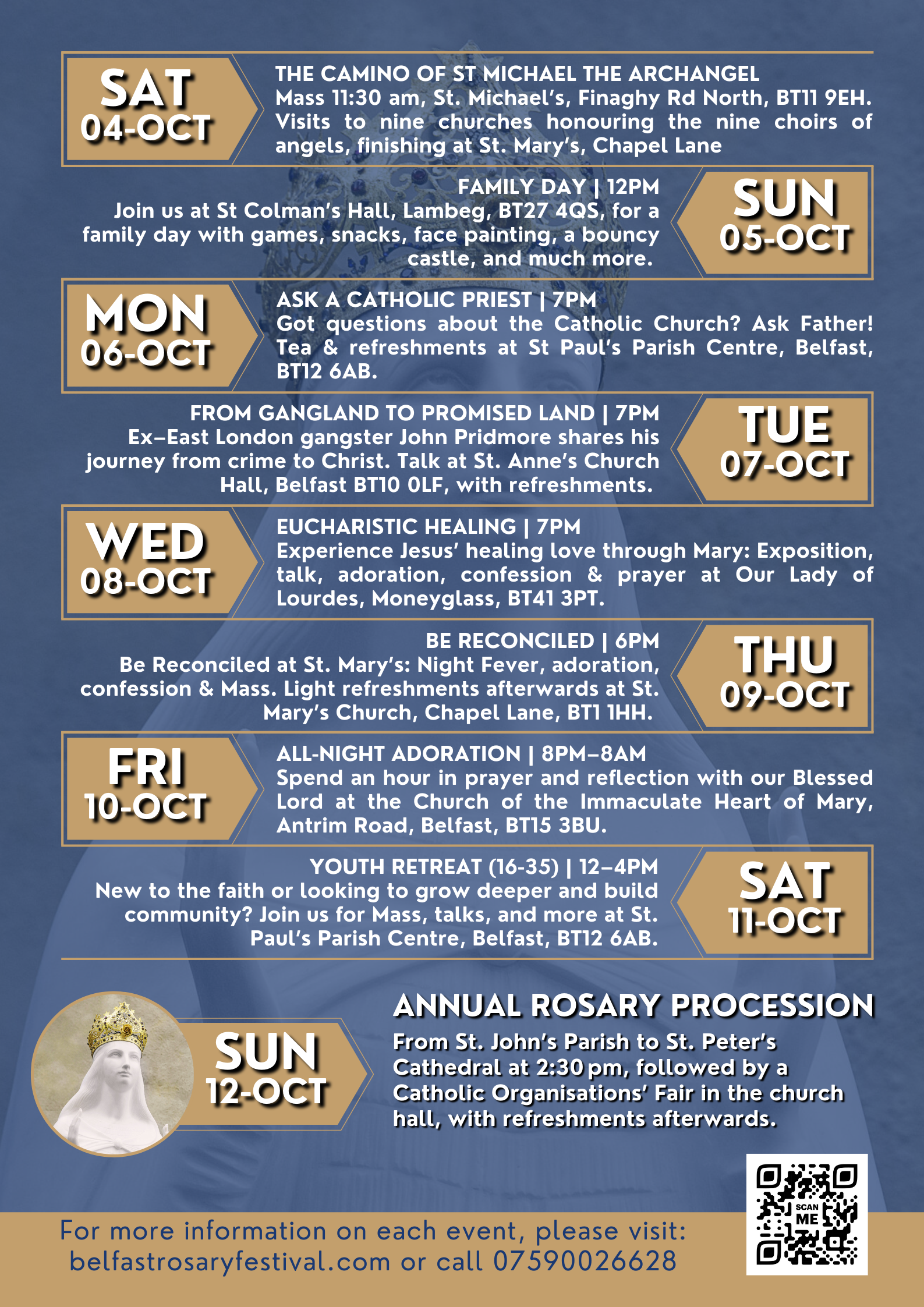 This is a special invitation made by Fr Graham for everyone to come along and take part at the Belfast Rosary Festival 2024. There will be 6 events in total, and there is something for everyone,